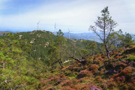 Wind turbines on the peaks covered with pines and flowering heather in the Xistral mountain range, in AbadÃn