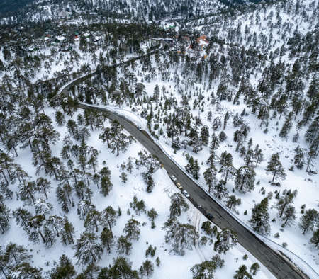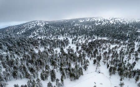 Drone aerial scenery of mountain snowy forest landscape covered in snow. Wintertime photograph
