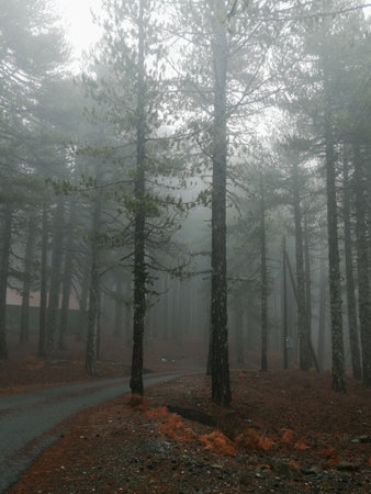 Mist in the forest in autumn. Bright light in the morning. Peaceful and serene, Troodos mountains cyprus