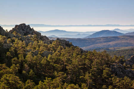 Panoramic of the Sierra de Avila, Skyline with fog at sunrise. Pico Cueva Valiente in Segovia and Madrid.