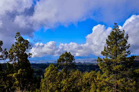 Composition of trees in the mountains against the blue sky, Free space. Travel inland to Gomera Island, Canary Islands. View from Garajonay National Park
