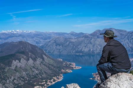 business man looking at mountains and bay. May thinking and making a decision. Montenegro, Kotor Bay