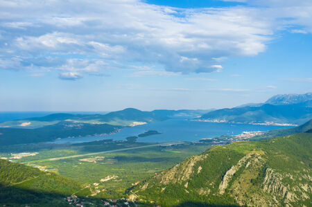 The aerial view on the indented coastline with the city of Tivat and its airport, surrounded by mountains, tiny islands and Adriatic sea, Montenegro.