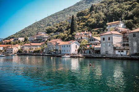 Traditional montenegrin village on Kotor bay in Montenegro. Stone serbian houses, clouds and mountain range reflected on water of Boka Kotorska.