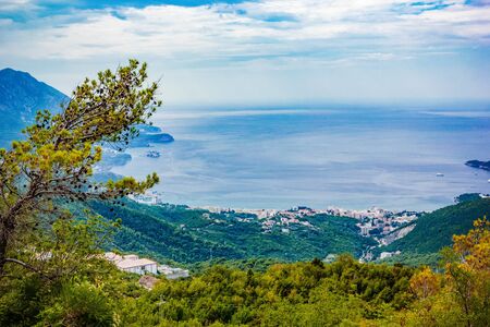 Panoramic view of landscape Adriatic sea, mountains on Coast Budva Riviera, Montenegro