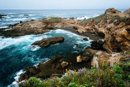 View of colorful flowers and algae on rugged coastline of Point Lobos State Natural Reserve in California