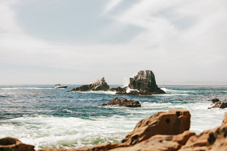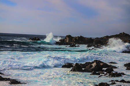Pacific Ocean waves crashing on the cliffs of the rugged Northern California coastline in Monterey