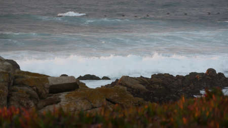 Rocky craggy pacific ocean coast, sea water waves crashing on rocks, 17-mile drive, Monterey California USA. Gloomy dramatic nature near Point Lobos, Big Sur, Pebble beach. Birds flying, rainy weather