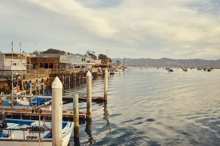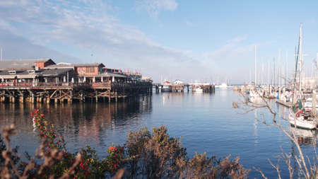 Colorful wooden houses on piles, pillars or pylons, ocean sea water, historic Old Fishermans Wharf, Monterey bay or harbor, California coast USA. Tourist beachfront promenade, waterfront boardwalk.