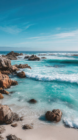 This image showcases a coastal scene featuring turquoise ocean waves breaking against a rocky shoreline. The composition includes brown rocks, foamy white water, and a clear blue sky. The sunlight enhances the colors and textures. Suitable for various uses, this image could be employed in editorial and commercial projects.