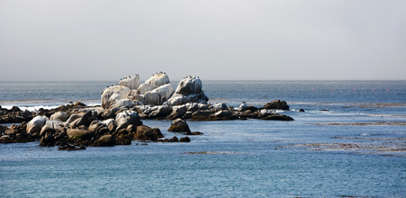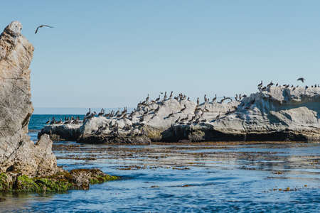 View of bird rocks and cliffs along Pacific Coast Highway 1 in California, a habitat and refuge for brown pelicans, cormorants, black oystercatchers, harbor seals, and western gulls, United States