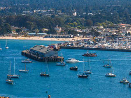 Beautiful aerial view of the Monterey town in California with many yachts docked by the pier.