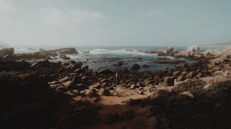 A scenic and dramatic view of a rugged, rocky shoreline. Dark stones and boulders frame the ocean water as waves gently roll in under a pale, hazy sky.