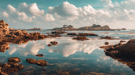 A stunning view of a tranquil ocean reflecting clouds above, framed by rocky shorelines and a distant island, creating a serene and picturesque landscape at sunset.