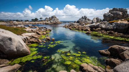 A beautiful coastal scene featuring rocky formations and vibrant green algae in calm waters. Bright blue sky and fluffy clouds enhance the tranquil atmosphere, ideal for relaxation.