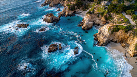 Rugged coast aerial, waves on rocks, blue water with foam, powerful nature design.