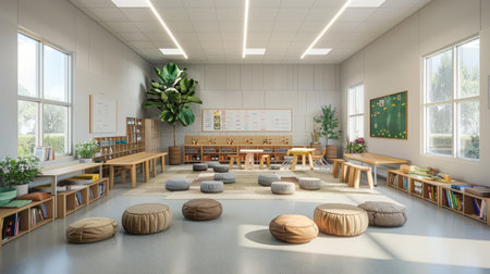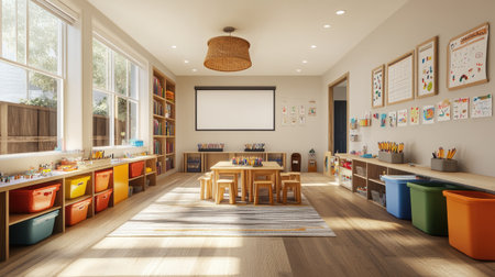 A bright and cheerful classroom designed for learning and creativity, featuring natural light, colorful storage, and inspiring decor for young minds.