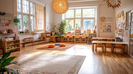 A bright classroom filled with natural light showcases an inviting learning space with playful decorations and organized furniture, conducive for engagement.