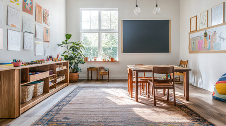 A bright and inviting classroom space filled with natural light, featuring a blackboard, wooden furniture, and engaging artwork, perfect for learning and creativity.