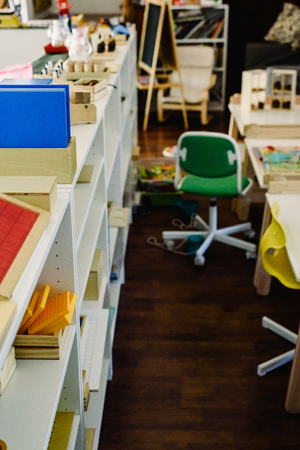 Table and shelving with montessori material, colored items and wooden cylinders to study geometry in the classroom.
