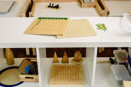 Wooden numbers in tables to learn mathematics in a Montessori classroom.