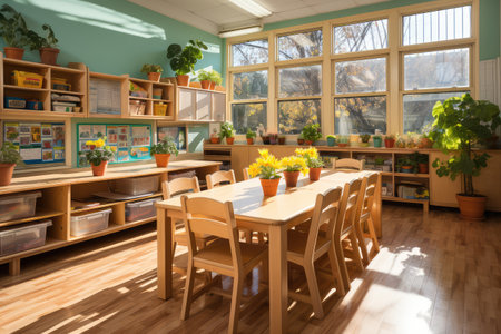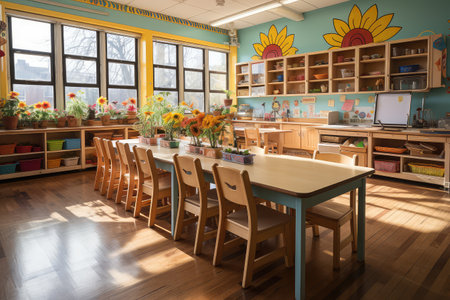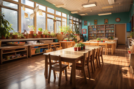A well-arranged classroom featuring wooden tables and chairs, colorful decorations, and vibrant plants, creating an ideal environment for creativity and learning.