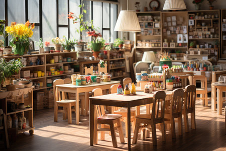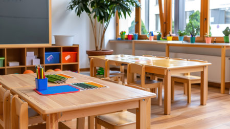Explore a bright and inviting classroom designed for young learners, featuring wooden furniture, colorful decor, and a creative atmosphere for educational activities.