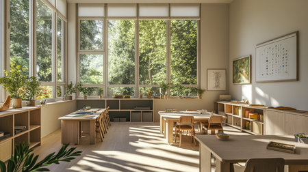 A bright and inviting modern classroom filled with natural light and greenery, featuring wooden furniture and a tranquil atmosphere, perfect for creative learning and collaboration.