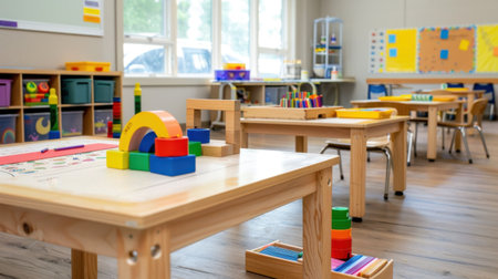 This vibrant classroom features wooden furniture, educational tools, and a bright atmosphere, designed for young kids' learning and creativity. The natural light enhances the inviting space, ideal for engaging activities and exploration.