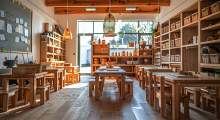 A spacious and inviting classroom designed for early childhood education, featuring wooden furniture, natural light, and a warm color palette for a nurturing learning environment.