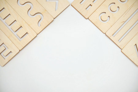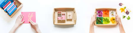 Montessori material flat lay. Banner Children hand. Home remote schooling Wooden tray on a white background.