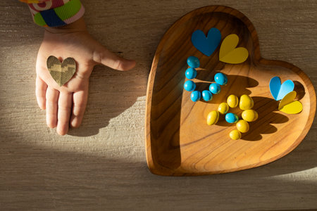 heart cut out of military camouflage fabric and yellow and blue letters UA, lined with candie