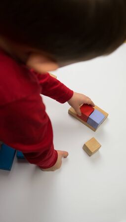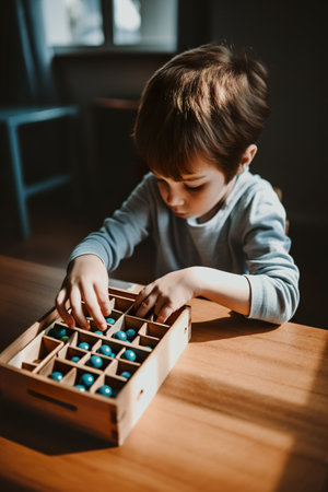 Young child, Caucasian boy, playing quietly with wooden toys, surrounded by a peaceful atmosphere. AI generative illustration of Montessori study materials