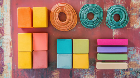 An alluring top-down view of colorful play dough and crafting materials creates an engaging visual on a rustic wooden table, perfect for creative projects.