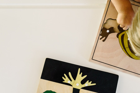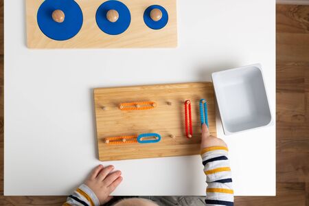 High angle view of child playing wooden educational game in montessori school, panoramic shot