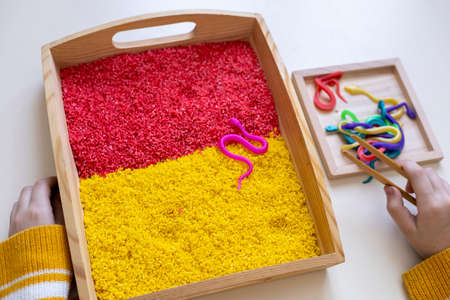 Top view of child hands, sensory box in Montessori school. Concept of using resources for teaching children. copy space