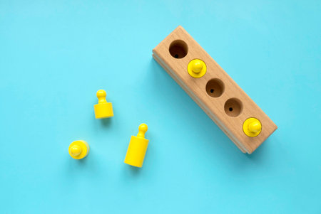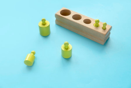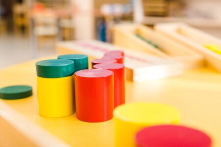 Montessori knobbed cylinders placed in random order. Puzzle pieces of various diameter and height. Disorder, confusion concept. High quality photo