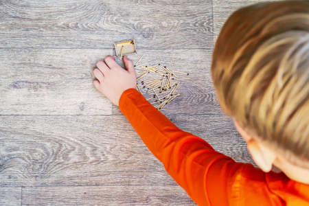 A child looks and plays with matches, a dangerous activity for a toddler at home.