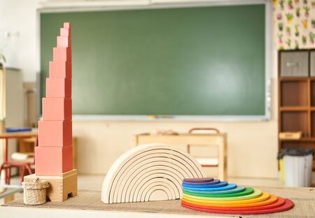 Toys and materials montessori in a classroom of a school for children