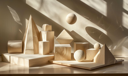 A collection of wooden geometric shapes, including squares, triangles, and circles, spread across a light surface showcases diverse textures and colors of wood.