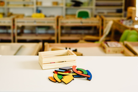 Selective focus of educational game on table in montessori school