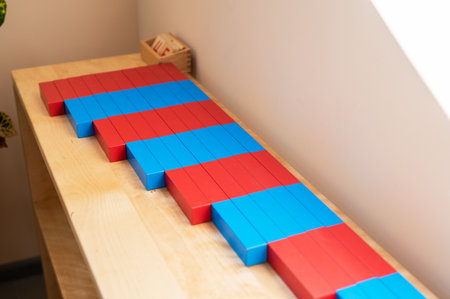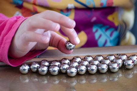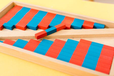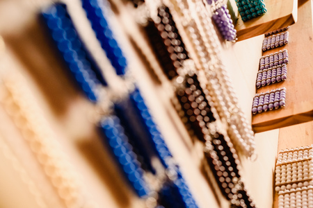 In montessori methodology, students learn mathematics using their hands with adapted materials, a girl learning game in class.