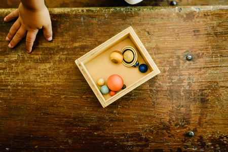 Child works with Montessori material for fine motor skills, sensory play. Playing children