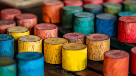 Close-up of vibrant, colorful wooden blocks arranged in rows, showing different colors and natural textures, ideal for educational or playful themes.