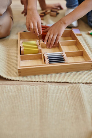 cropped view of interracial children playing with wooden sticks in montessori school, banner