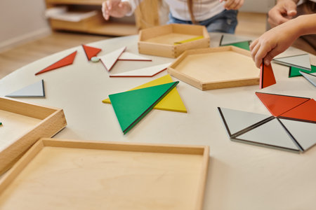 cropped view of teacher and kids playing with triangles on table in montessori school
