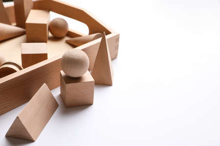 Set of wooden geometrical objects in box on white background. Montessori toy