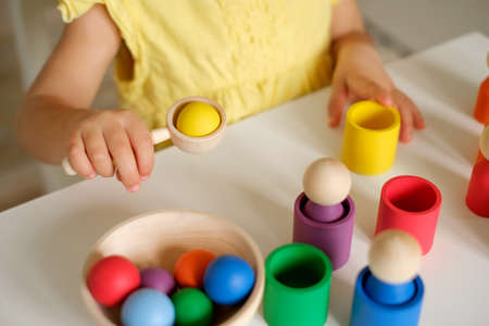 The girl puts colored balls in a wooden spoon and throws them into cups of the corresponding color. The child learns colors. A sorter toy for studying flowers by preschool children. A two-year-old kid