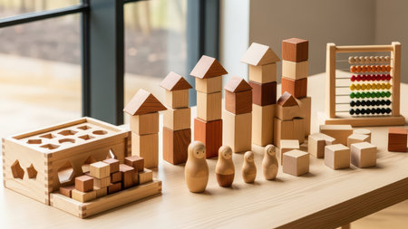 Wooden blocks and toys on a table near window in cozy setting.