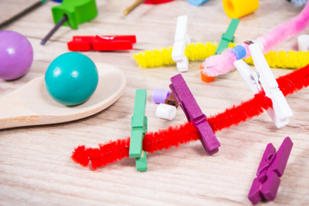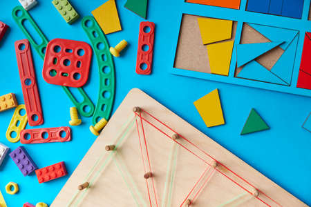Different colorful accessories used to play or learn at school and preschool. Development of children motor skills, coordination, creativity and logical thinking